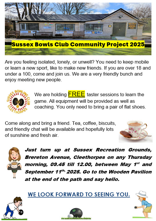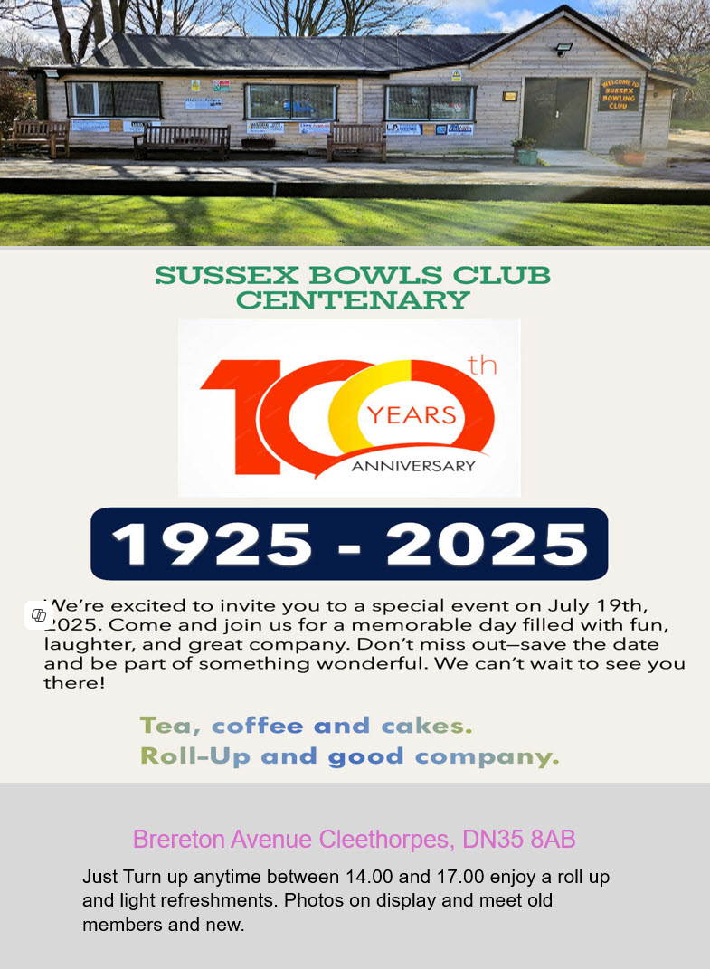 Welcome to Sussex Bowls Club Bowling Grimsby Grimsby and District Bowls Association Explore The Universe Join Our Facebook Group Roll - Ups Roll – Ups are now up and running.Wednesdays 10.00 until 12.00 and Fridays 13.30 until 16.00.Also Saturdays and Sundays 10.30 until 12.30All times are approximate and weather dependantTurn up and have fun … Games Afternoons. Tuesday 13.00 until around 15.30 Mah Jong.Thursday 13.00 until around 15.45 Rumikub.No experience needed, come and join us. Talk To Us Have any questions? We are always open to talk about any questions you may have. Please do not hesitate to contact us or join our Facebook Group. Get In Touch Social Events We have regular Social Events. Fish and Chip lunches, Bingo, Ten Pin Bowling, Fun Days, and the occasional High tea. Plus:We have our regular board games sessions. One of Our Sponsors Olivers Eatery(Jonny Donuts) Supporters of Sussex Bowls Copyright © 2025 Sussex Bowls Club, Owned and Maintained By Steve Artingstall